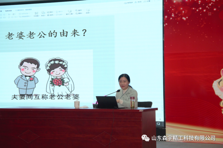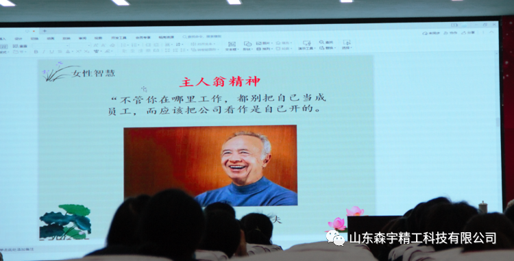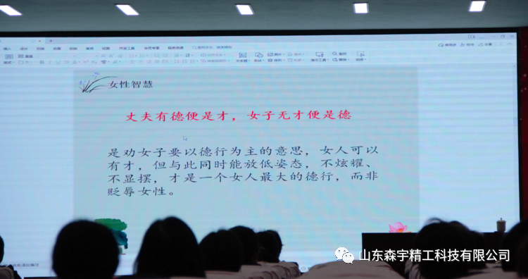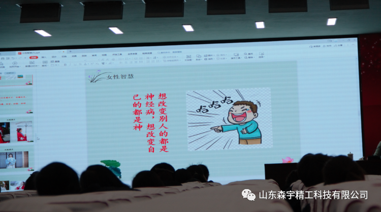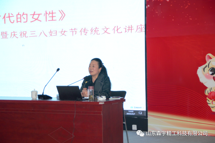 2022年3月7日,山東森宇精工科技有限公司在新辦公樓多動能廳舉辦了《智能時代的女性》傳統(tǒng)文化講座活動。慶?!叭恕眹H婦女節(jié),傳承中華文化,弘揚傳統(tǒng)美德,營造文明祥和的社會氛圍。